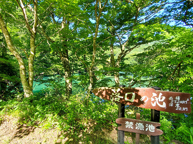 ブナ自然林から進んで進んで行くと見えてくるのが「沸壺(わきつぼ)の池」。青池と同様に青く見える池となっています。