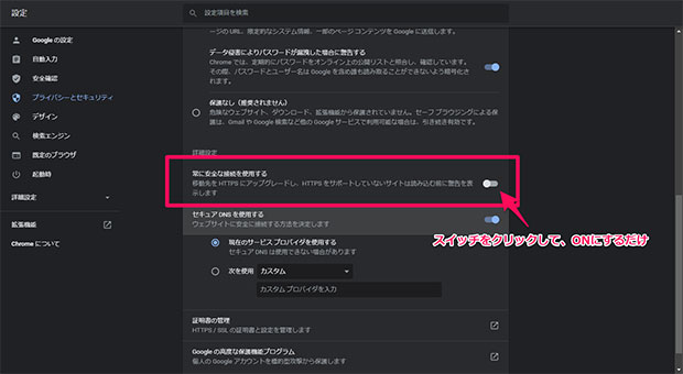 - 「詳細設定」にある「常に安全な接続を使用する」をONにする